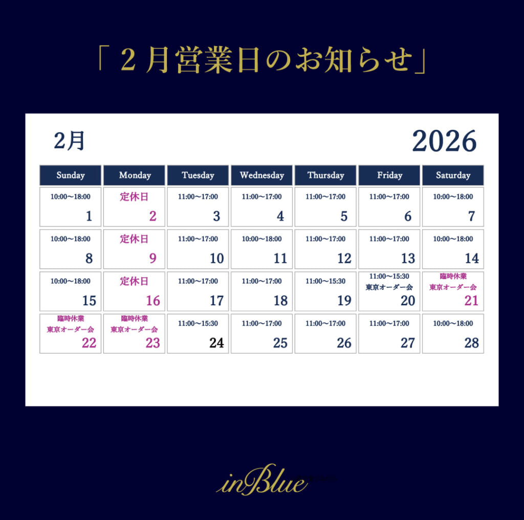 04 Feb. 2026 2月営業日のご案内 ▪休業日▪・2日(月)、9日(月)、16日(月)、21日(土)、22日(日)、23日(月)▪営業時間▪・平日:11:00~17:00 20日(金)、24日(火):11:00〜15:30・土日祝:10:00~18:00 (営業時間が変更になる可能性がございます) オーダーをご希望の方は、右下の「来店予約」からご予約をお願いいたします。 Back Blog list